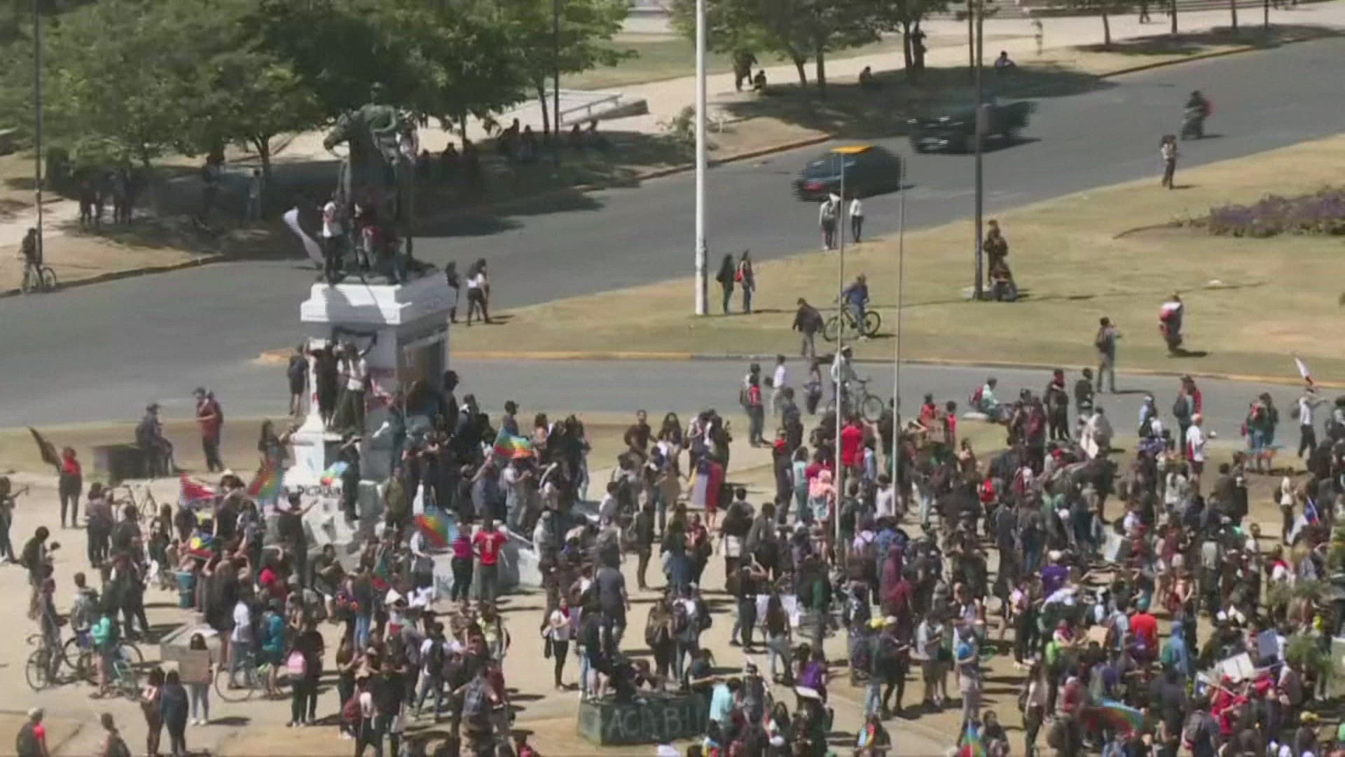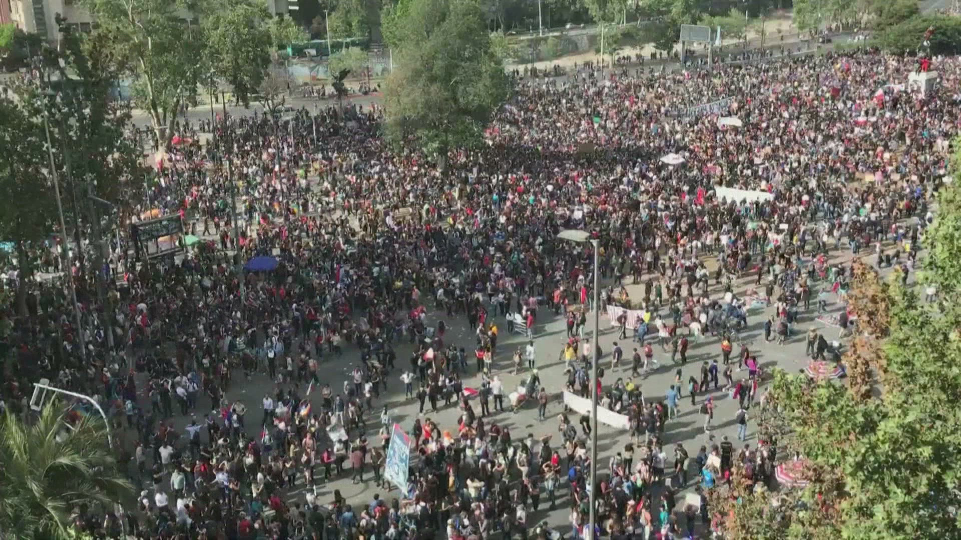 Chilean teachers march demanding better working conditions Thousands of Chilean professors march in the streets of Santiago, during a 48-hour strike, protesting against President Sebastian Pinera's government and demanding better working conditions. IMAGES AND SOUNDBITES