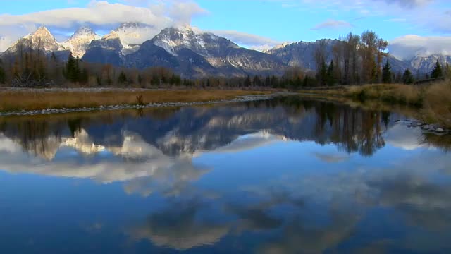 > The Grand Teton mountains are reflected in a mountain lake.