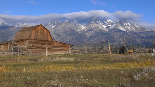 > An old barn rises out of a prairie with the Grand Tetons in the background.