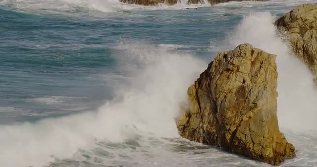 > Waves crash over rocks.