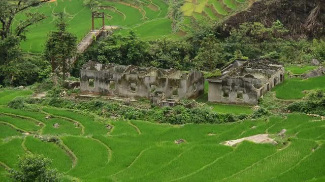 A breeze blows over a lush green terraced hill on a rice farm.