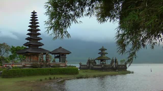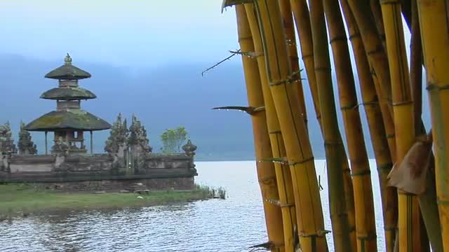 180912 - A bamboo forest reveals a Asian temple on lake Bratan, Bali, Indonesia..