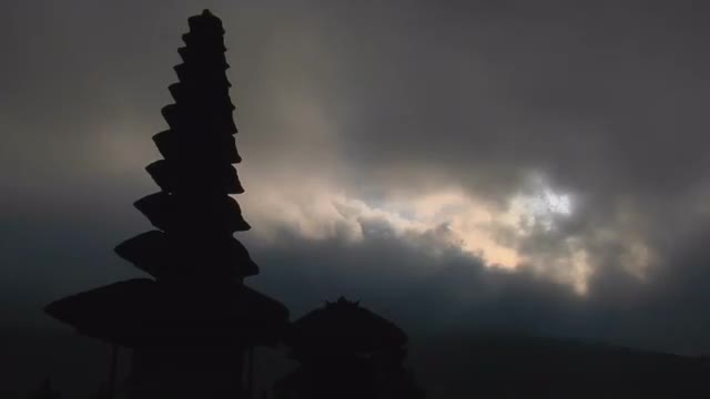 > Part of a Balinese temple stands in silhouette.