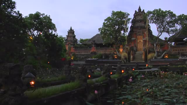 > Lights flicker on the grounds of a temple in Bali, Indonesia.