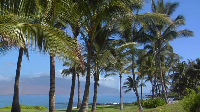 Palm trees grow along a beautiful stretch of beach in Hawaii.