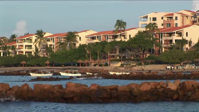 > Small waves move along the shoreline in front of rowboats and beachfront homes.