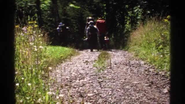 730237 - 1971: party of 5 men walking away from camera in a rural path with backpacks. ISLE ROYALE MICHIGAN