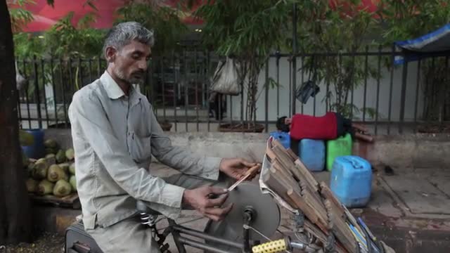 > A man is repairing a part on the handlebar of a bicycle.