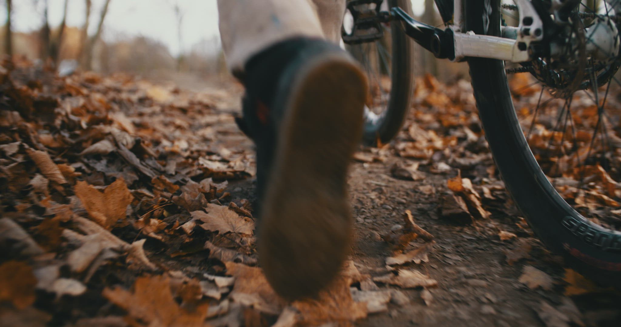 2119546 - bmx biker walking through autum leaves down low following 4k