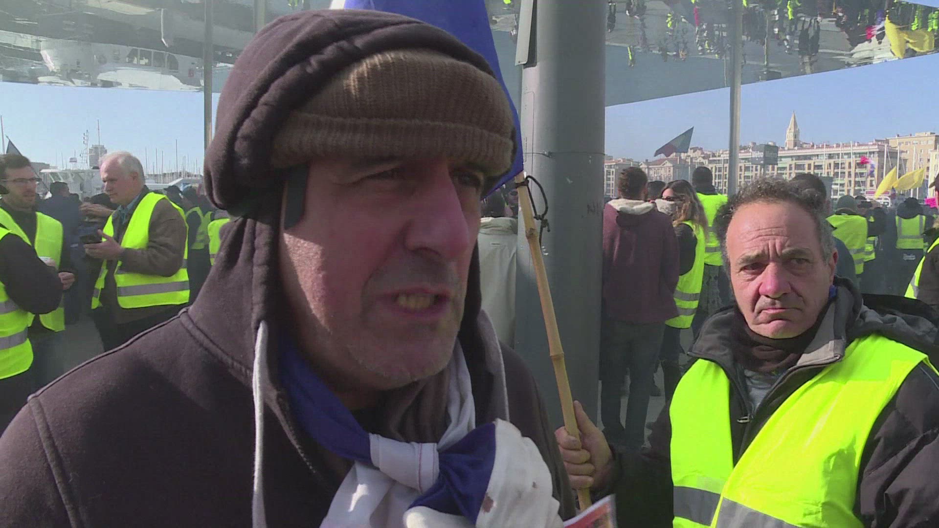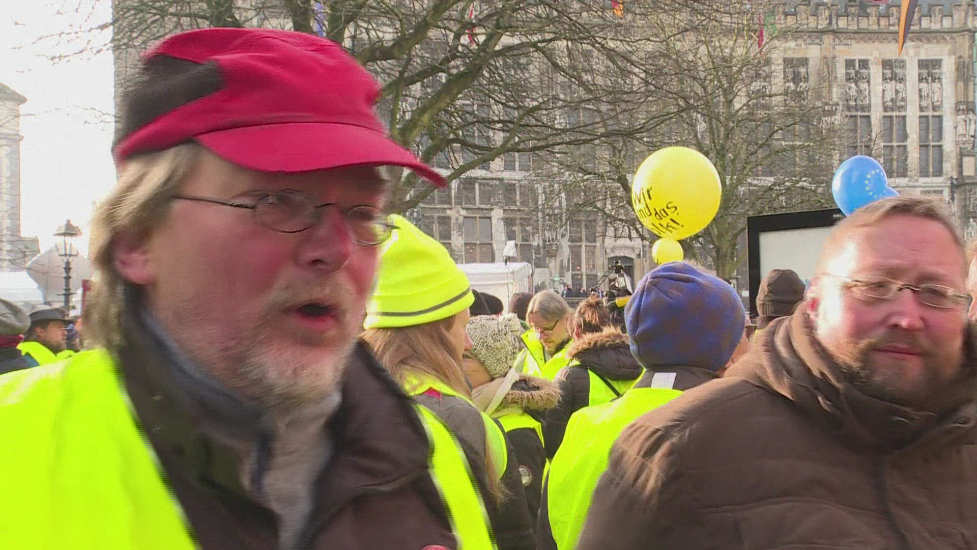 Yellow vest demonstrators descend on Aachen during treaty talks Yellow vest demonstrators gather to greet French President Emmanuel Macron with jeers as he arrives at the Aachen town hall to sign a Franco-German treaty. IMAGES of yellow vest demonstrators in Aachen, Germany and President Macron arriving