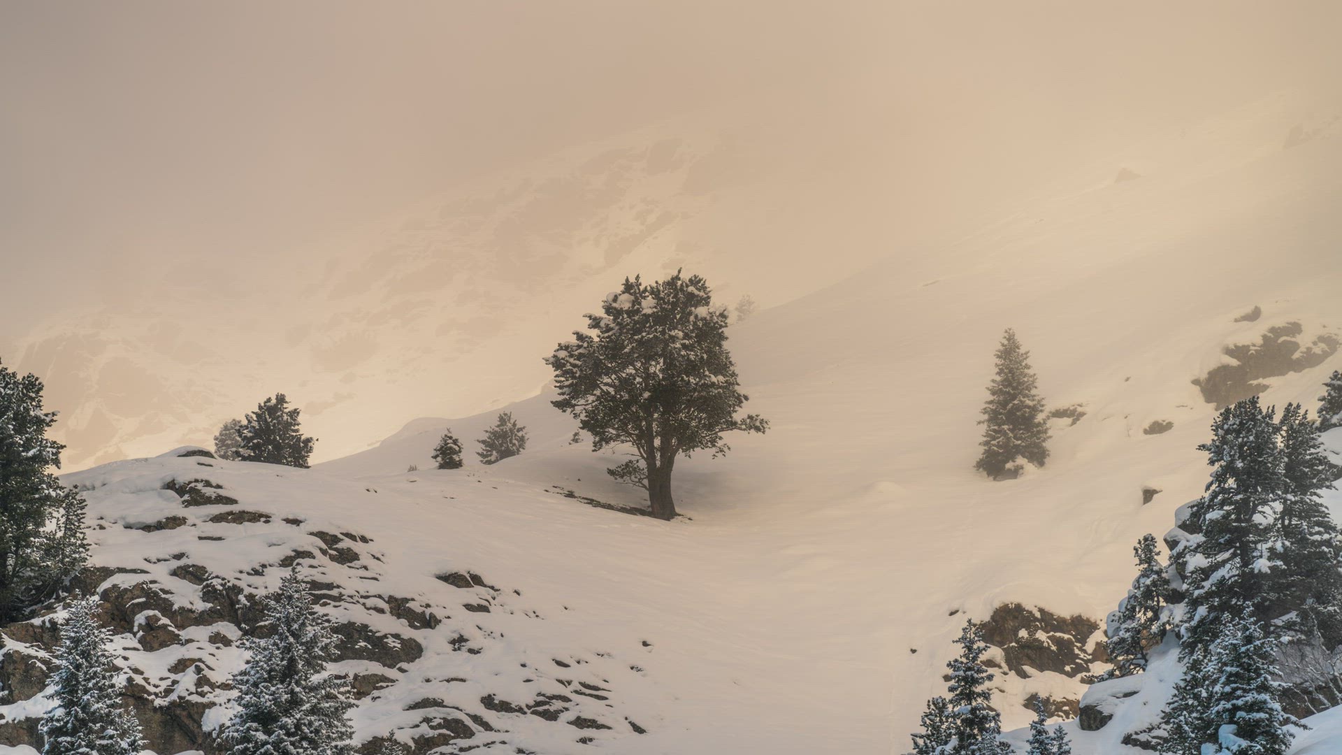 A hillside clock and sign structure is illuminated in the snowy evening.
