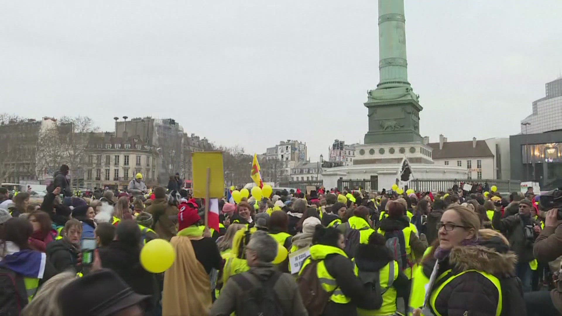 Women 'yellow vests' protest day after violence Several hundred women "yellow vests" gather in Paris, on Place de la Bastille, to give a different image to the movement, in the aftermath of 'Act VIII' marked by new violence.