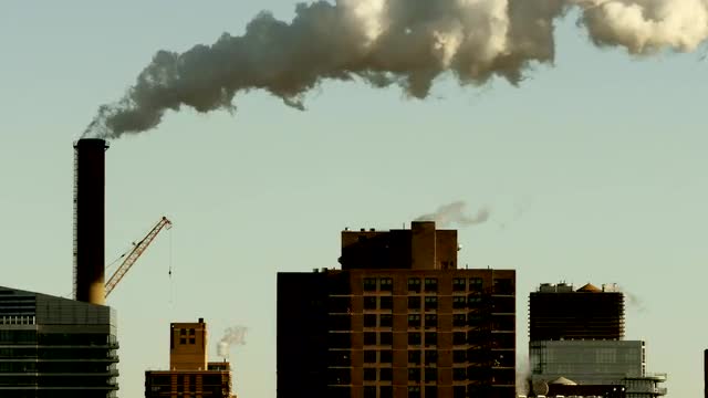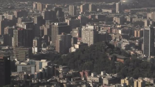 Pan across the smog filled city of Santiago to the Andes Mountains, Chile.