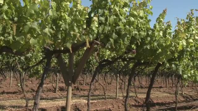 A dolly move through a row of merlot wine vines in Talca, Chile.