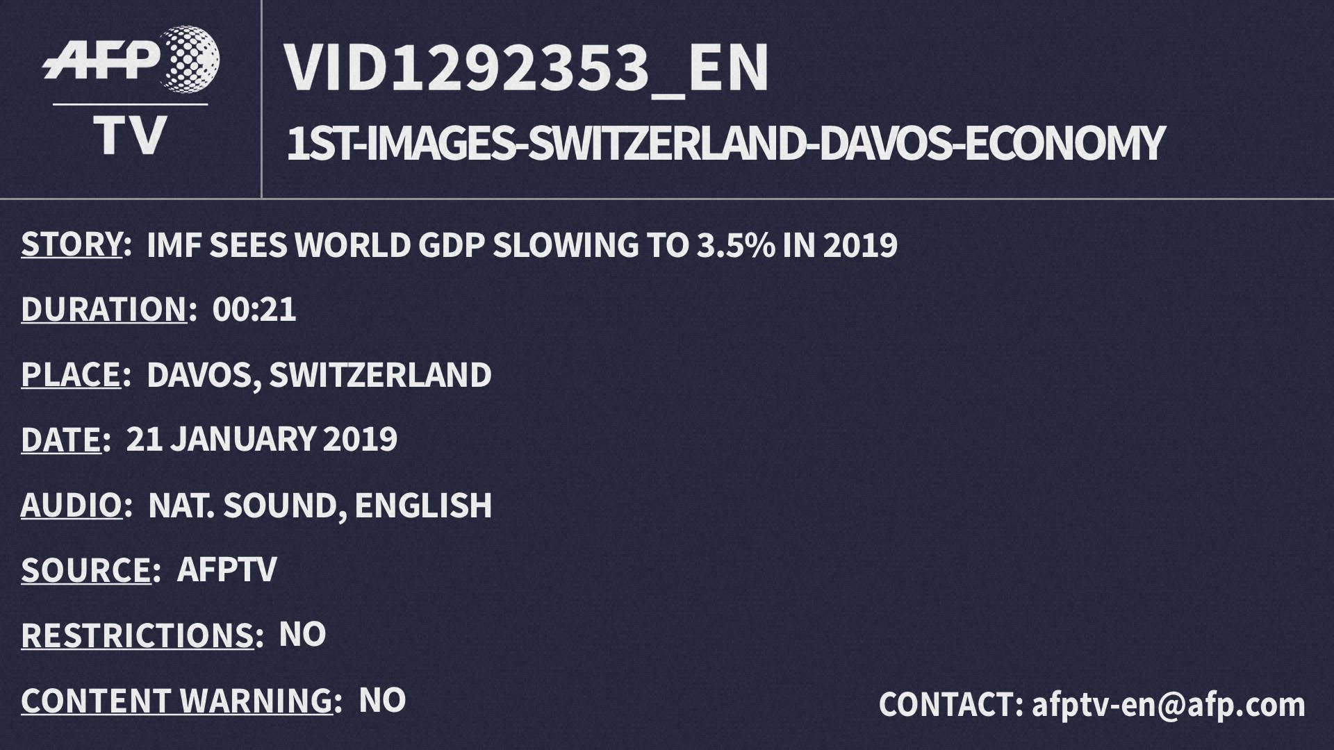 Risks rising as world economy grows slower than expected: IMF IMF chief Christine Lagarde warns of rising risks as world economy grows more slowly than expected but says that does not mean a global recession is around the corner, at the World Economic Forum in Davos. IMAGES of IMF press conference AND SOUNDBITES from IMF chief Christine Lagarde and Gita Gopinath, IMF chief economist