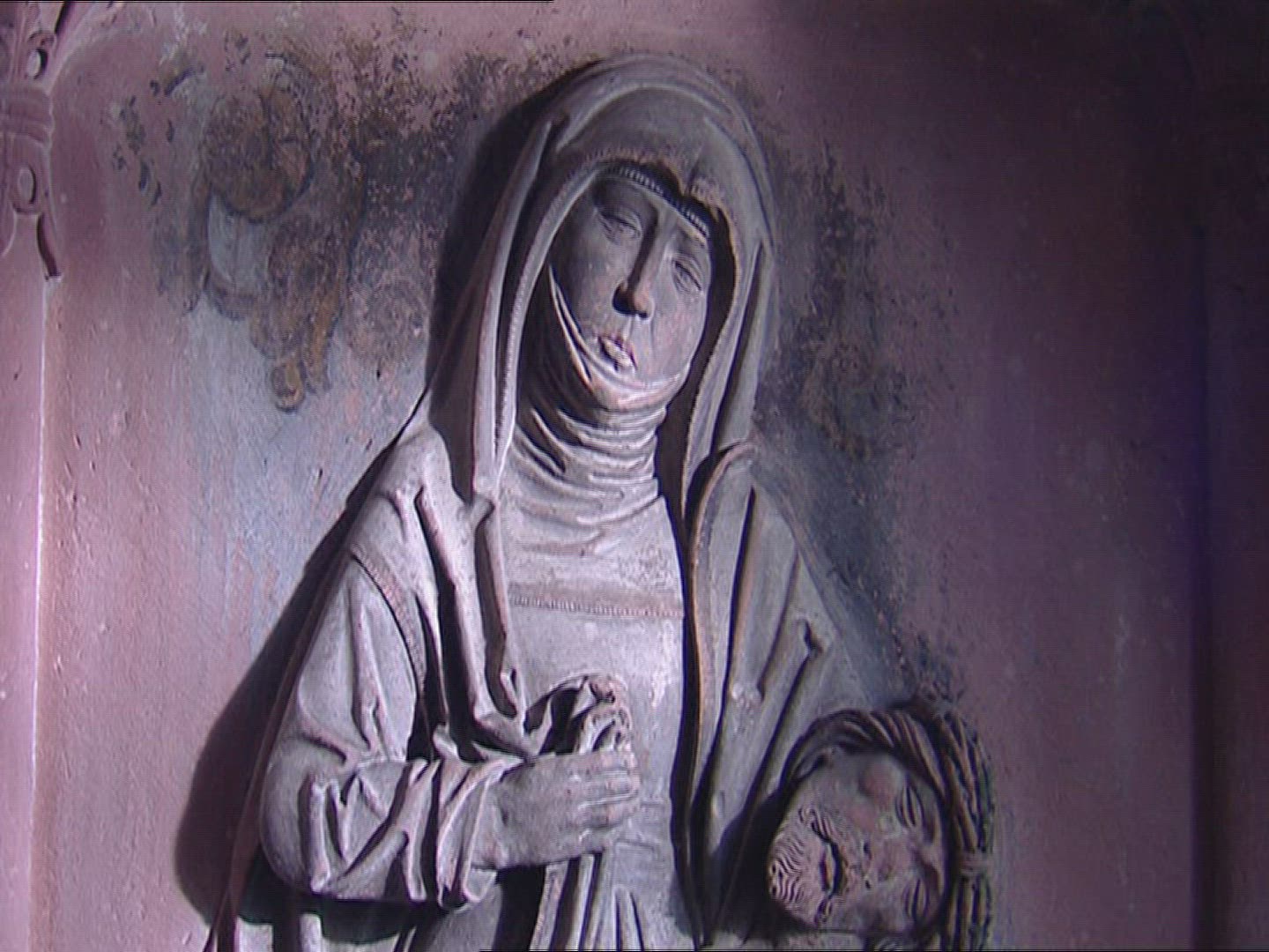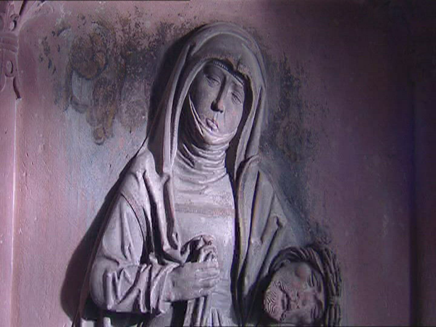 A vertical pan of a painting of Mary and Christ, located in Huilquilemu, a colonial estate that is now a museum in San Clemente, Chile