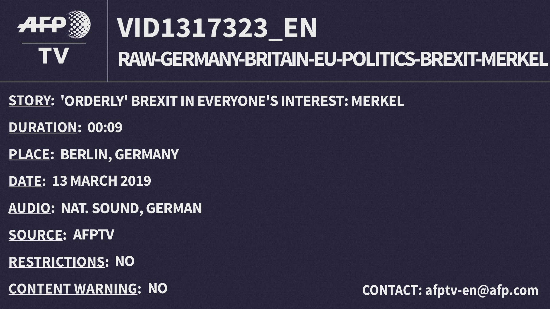 'Orderly' Brexit in everyone's interest: Merkel German Chancellor Angela Merkel insists that an "orderly" Brexit is in the interest of both Britain and the EU, ahead of a British vote on a potentially chaotic "no-deal" exit. SOUNDBITE of Angela Merkel.