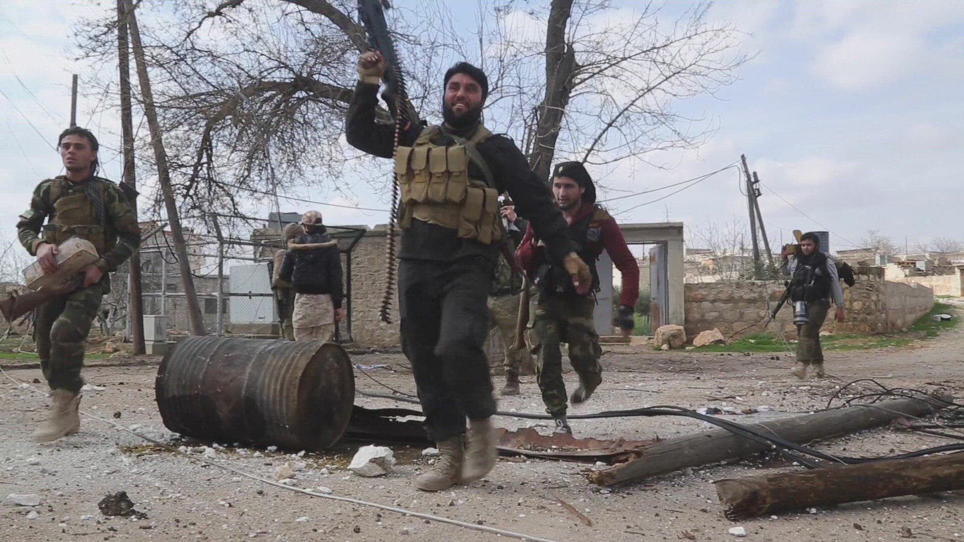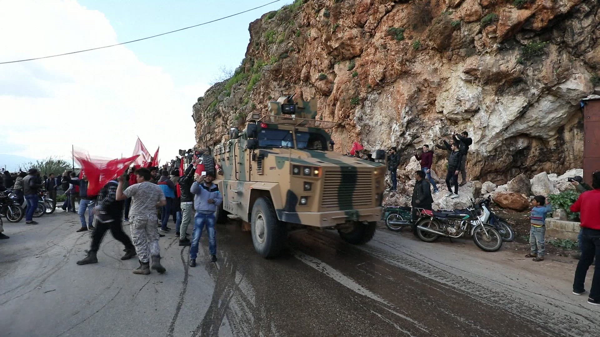 Turkish military vehicles patrol in Syria's Idlib and Aleppo Armoured Turkish military vehicles patrol along a road between Syria's northern Idlib and Aleppo provinces. IMAGES