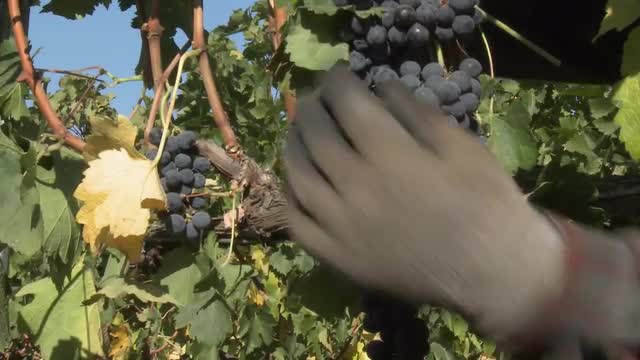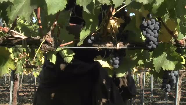 > A cellar crew tops off wine barrels during harvest in California wine country.