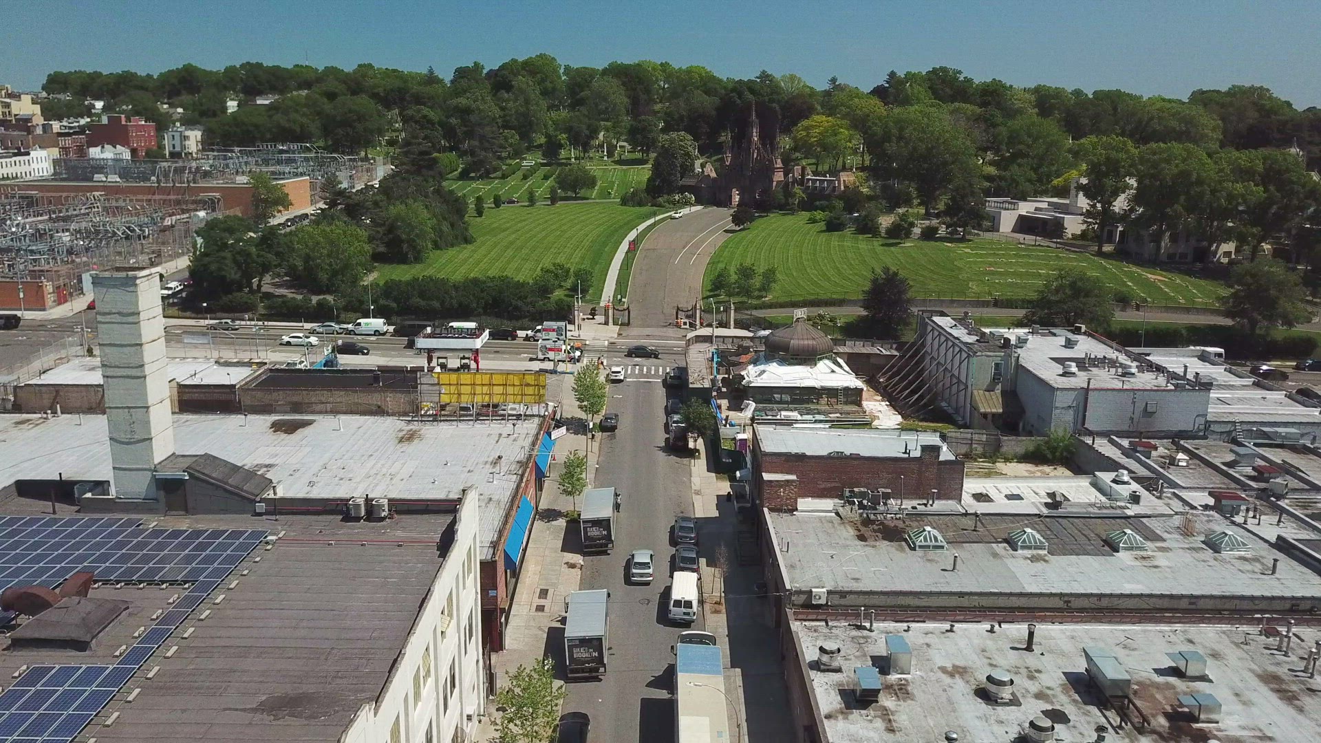 A green apartment building rises along a neighborhood street.