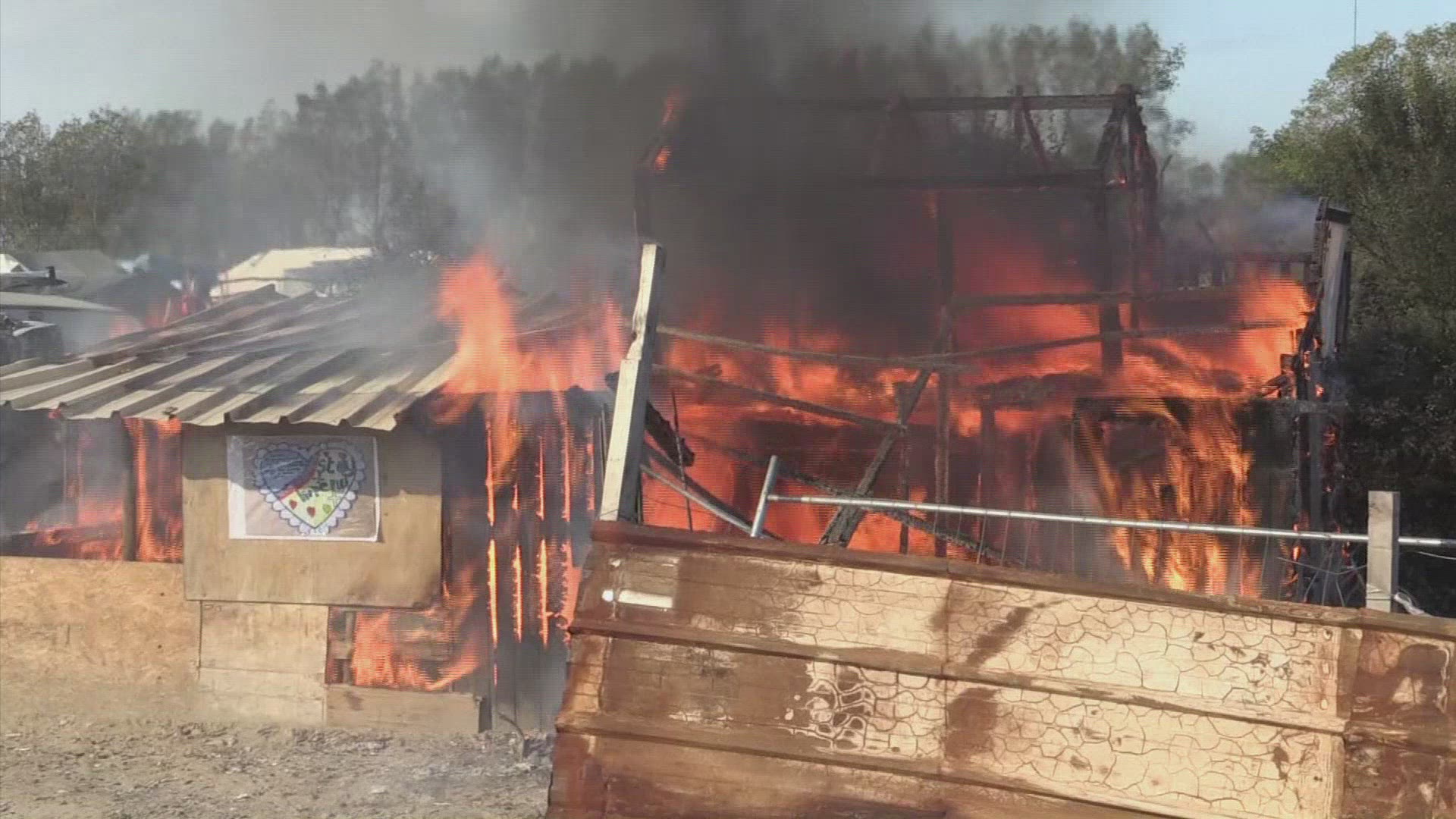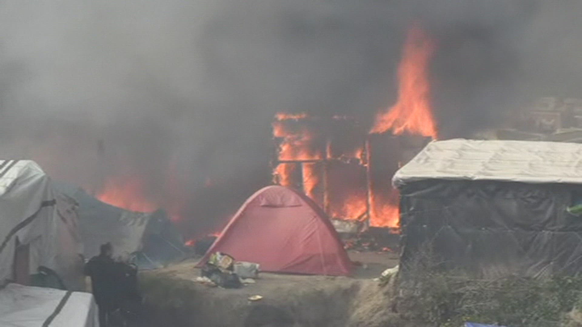 > Flickering orange flames burn in a blazing fire.