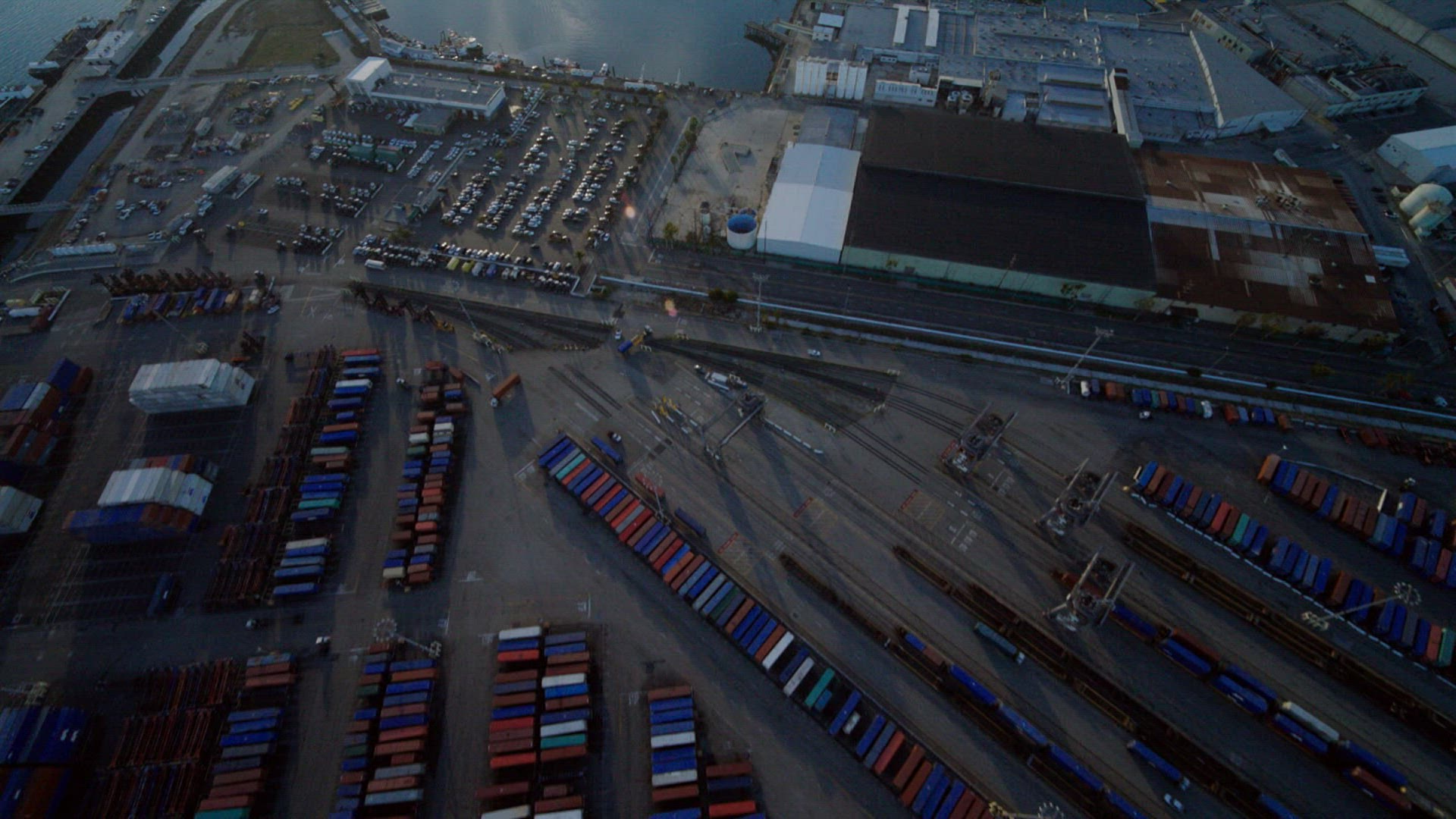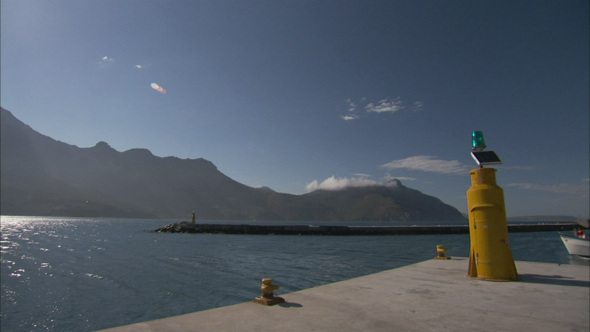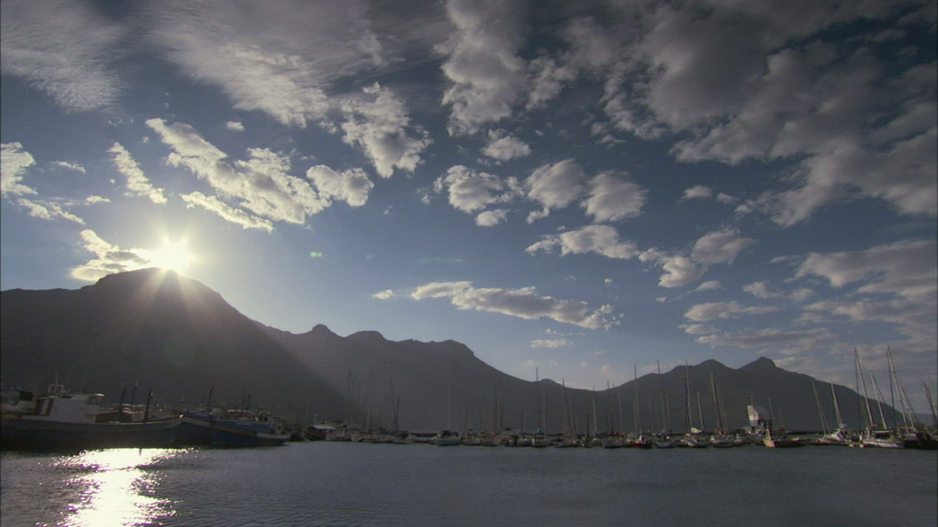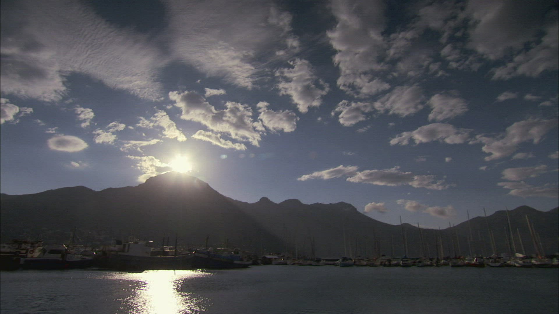 A harbor reflects sunlight during the golden hour.