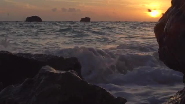 The sun glows behind clouds in a red and orange sky.