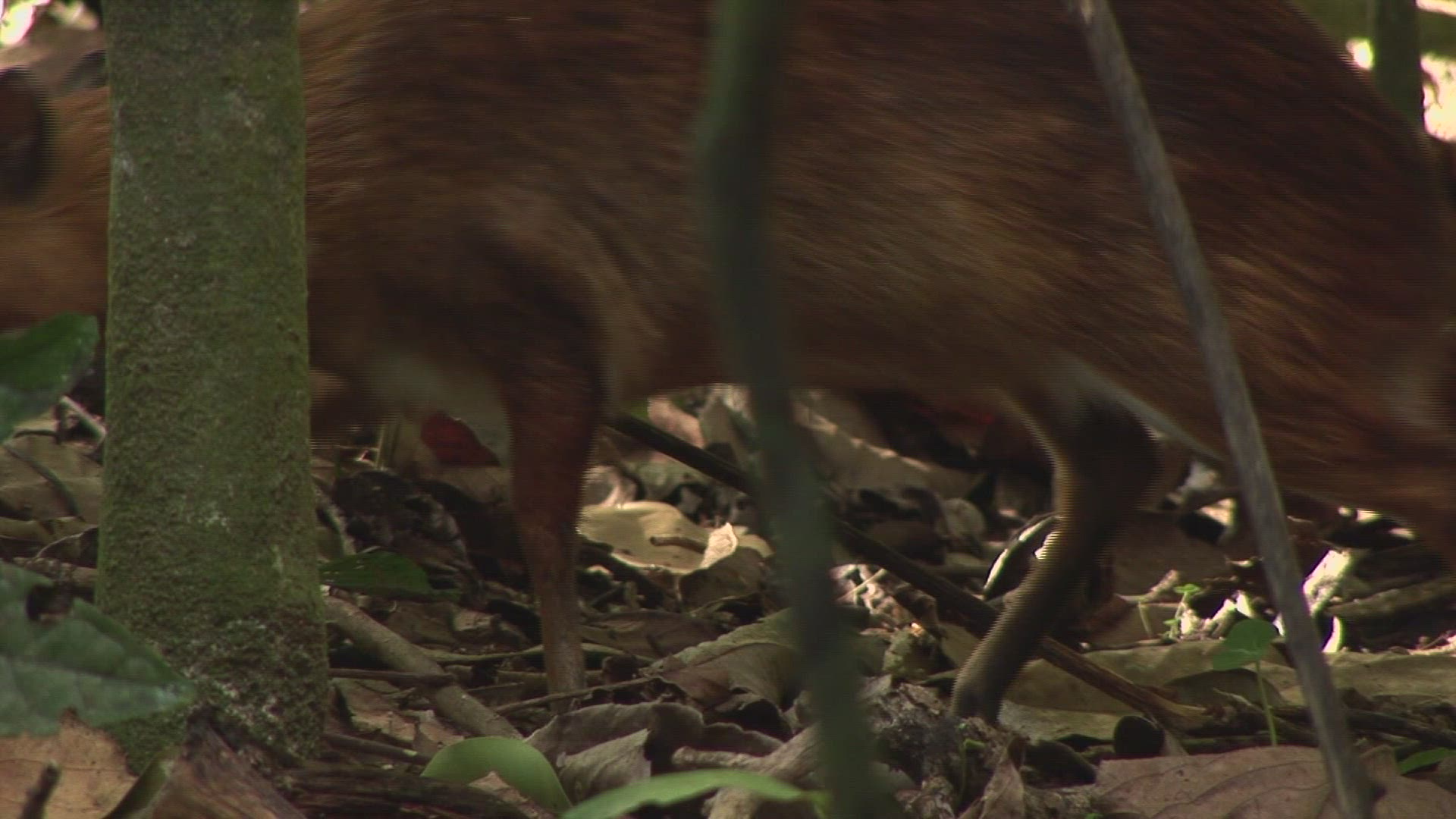 > A buck walks in the woods.