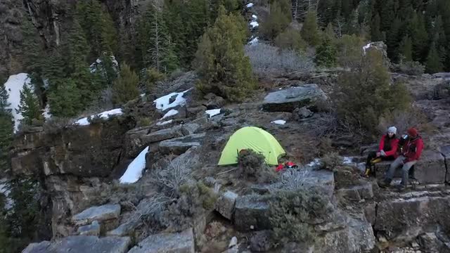 1064751 - Flying towards tent on top of a cliff looking down at the campsite