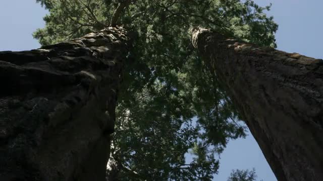 > Shadows move over tree trunks in a forest.