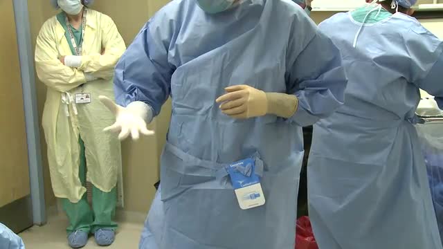 738700 - Doctor putting on medical glove in operating room
