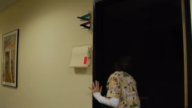 > A medical professional places paperwork into a container outside a room.