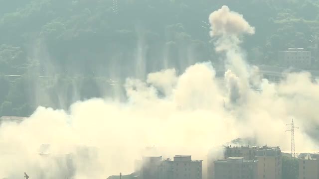 Italy demolishes remains of Genoa bridge The two remaining towers of the motorway bridge in the Italian city Genoa that collapsed nearly a year ago killing 43 people were demolished on Friday to make way for a new structure, authorities said. IMAGES AND SOUNDBITES
