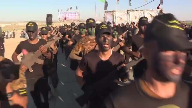 Palestinian youth graduate from Islamic Jihad training camp Palestinian youth chant slogans and carry wooden rifles as they take part in a military-style graduation ceremony organised by the Islamic Jihad movement in Gaza City. IMAGES AND SOUNDBITES