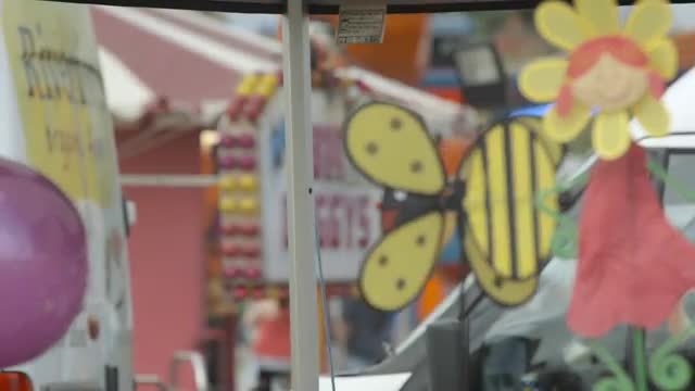 327251 - Slow motion of woman in red dress walking and posing next to red volkswagon bug.