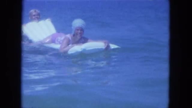 > A group of women swim across a pool, turn and start back.