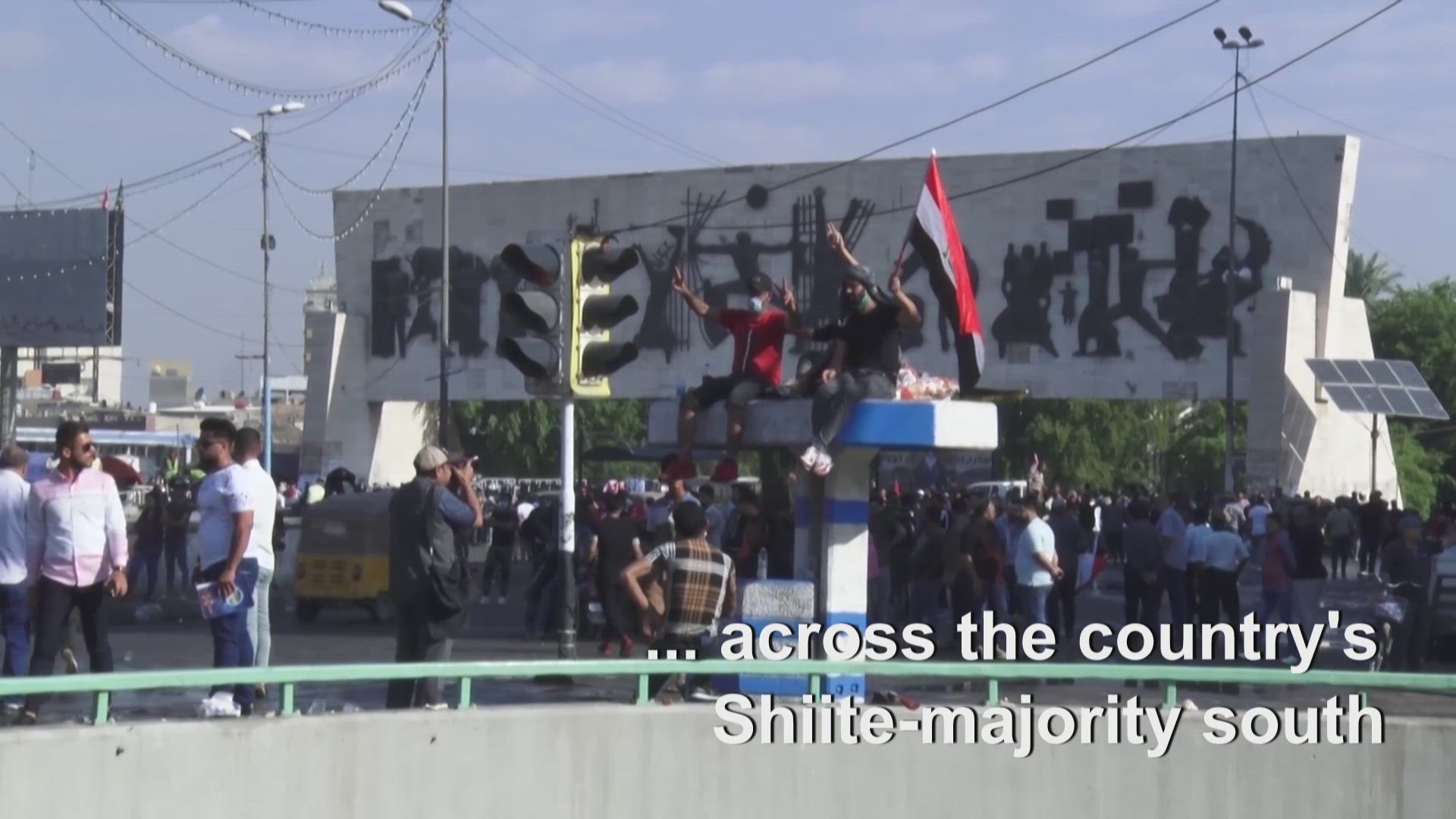 Iraqis participate in ongoing anti-government protests in Baghdad Iraqi protesters wave national flags as they continue to participate in anti-government demonstrations in Tahrir square and on Al-Jumhuriyah Bridge, which leads into the high-security Green Zone in the capital Baghdad. A first wave of demonstrations erupted on October 1 over corruption and unemployment but has ballooned throughout the month, now insisting on a government overhaul. IMAGES AND SOUNDBITES