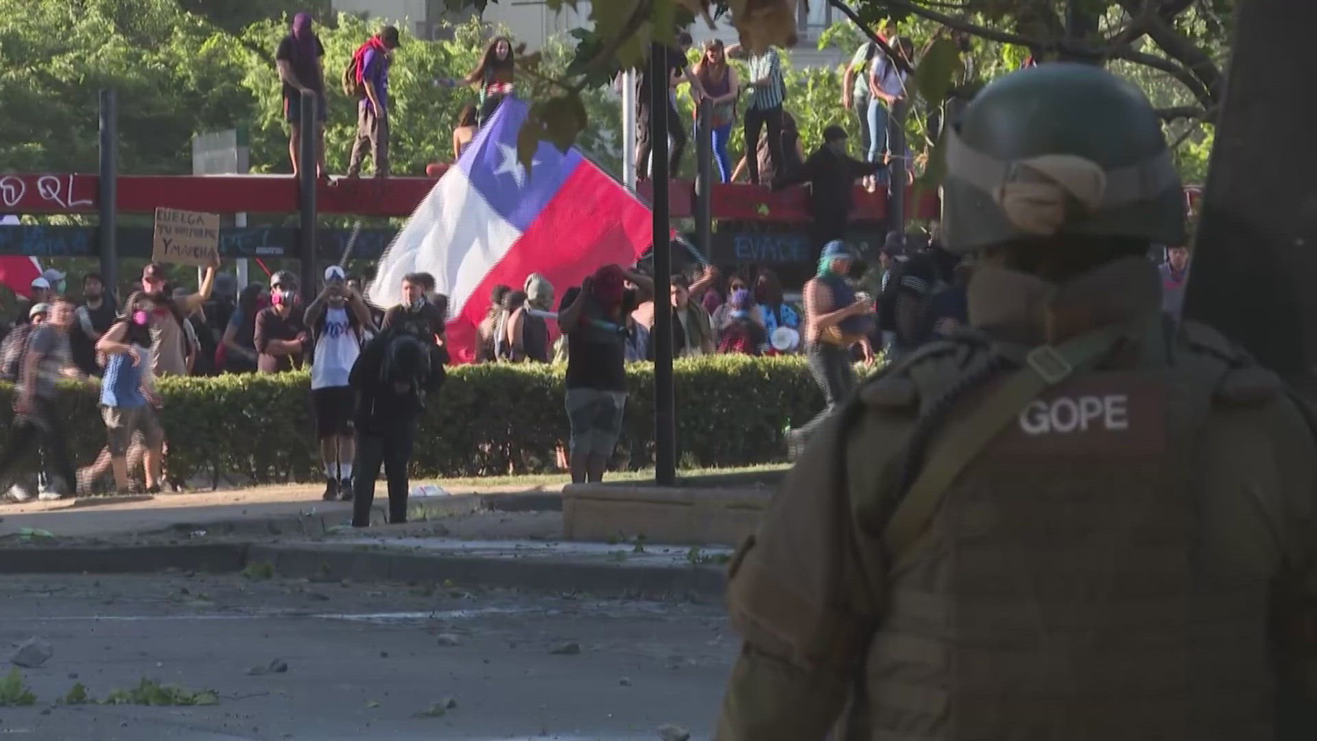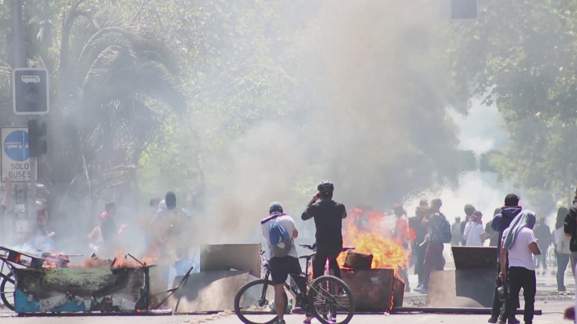 Protests continue in Chile's capital Protests in Chile continue as President Sebastian Pinera was to meet today with leaders of Chile's political parties in hopes of finding a way to end street protests that have now claimed 15 lives. IMAGES