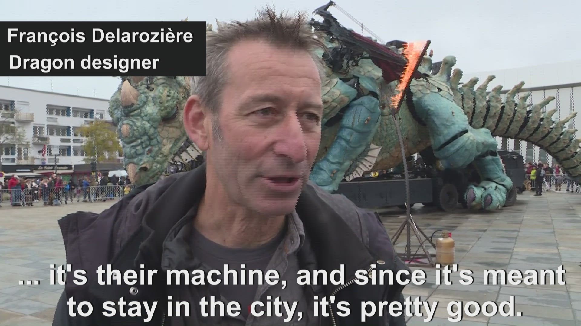 Fire breathing dragon descends on Calais A 25-metre-long, fire breathing dragon has descended on Calais, delighting visitors during the city's three-day-long 'Uban Show'.