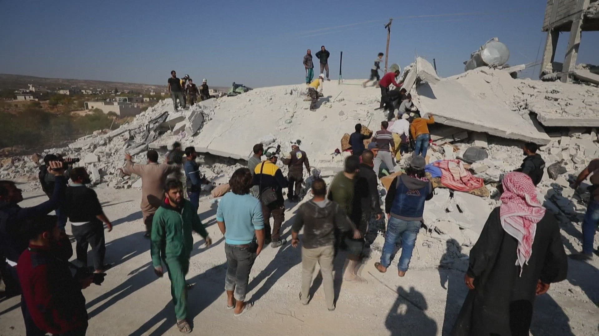 AERIAL SHOTS of mass destruction in Syria's Kafranbel in the Idlib province AERIAL SHOTS of mass destruction in the rebel-held village of Kafranbel in Syria's northwestern province of Idlib. AERIAL SHOTS