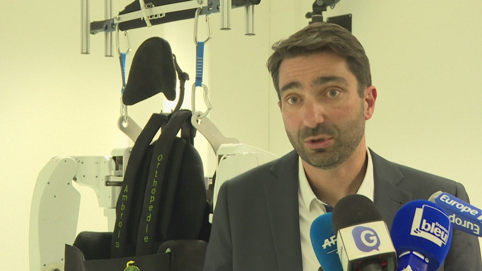 Paralysed man walks again with brain-controlled exoskeleton A French man paralysed in a night club accident can walk again thanks to a brain-controlled exoskeleton. Scientists present the results of a clinic trial at biomedical firm Cinatech in Grenoble. IMAGES AND SOUNDBITES