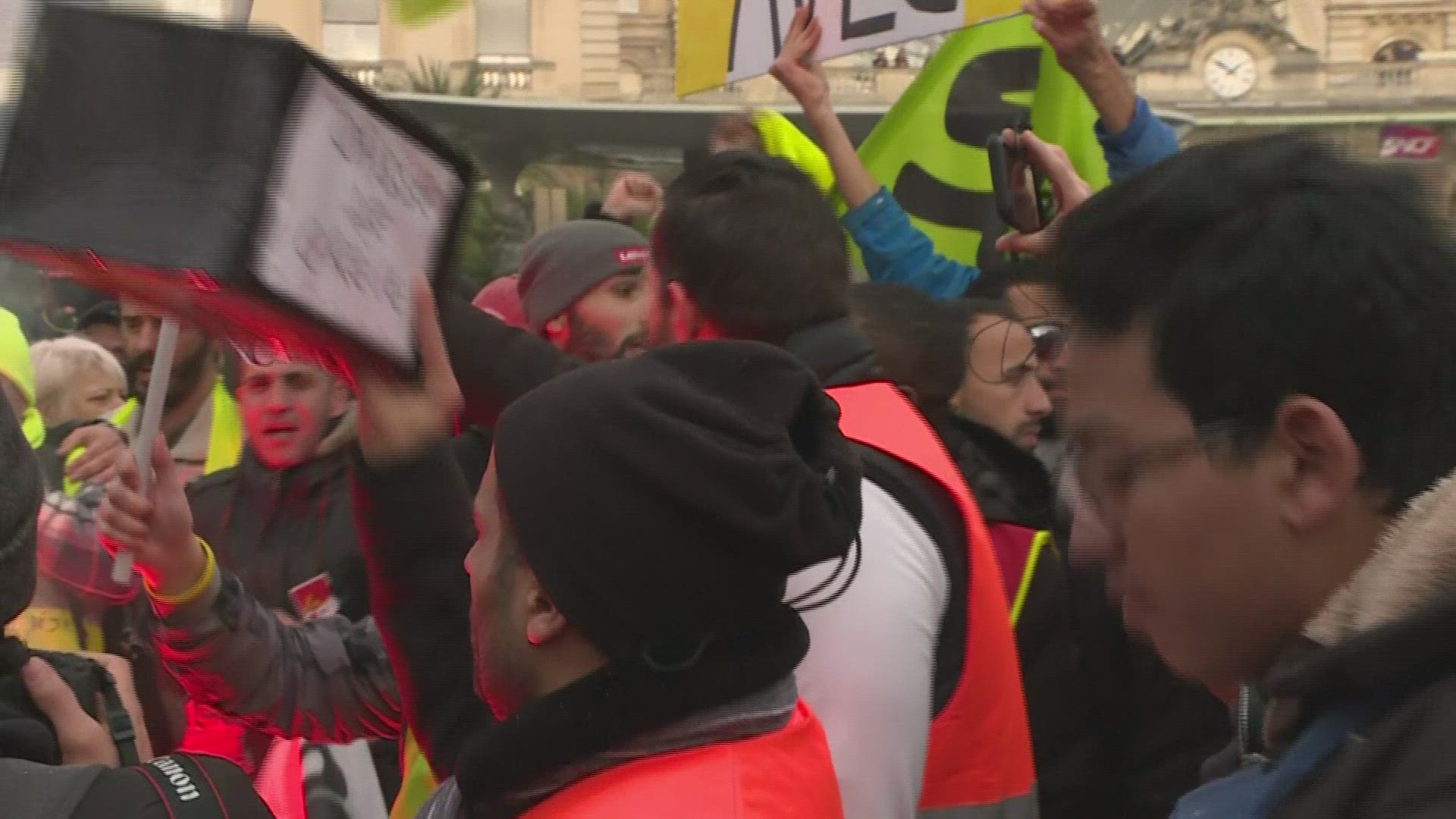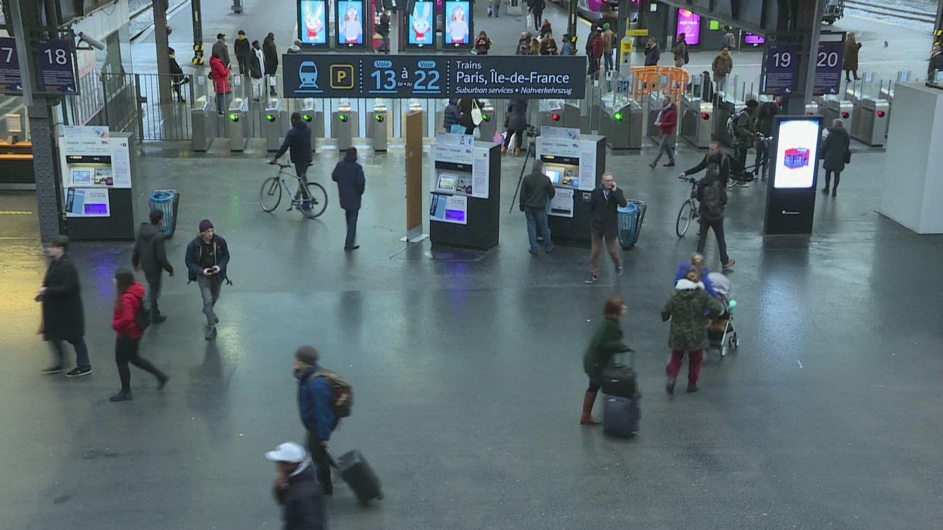 Commuters struggle with strike chaos at Gare de l'Est Commuters face the struggle of trying to reach Paris from the suburbs amid a nationwide strike over pension reforms. But after these public transport users finally reach Gare de l'Est station in the capital, they then face the obstacle to trying to get on one of the few buses running to try to get to work. IMAGES AND SOUNDBITES
