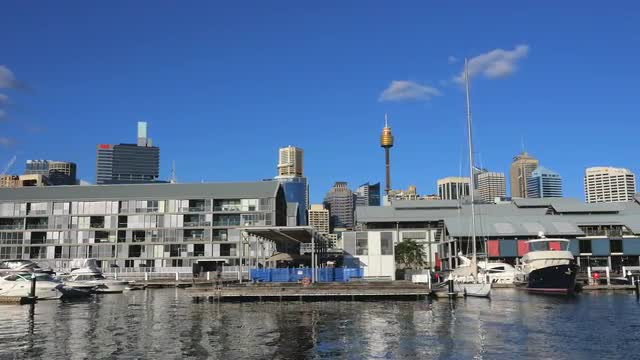 > Panning shot of Darling Harbor and Sydney city 4k
