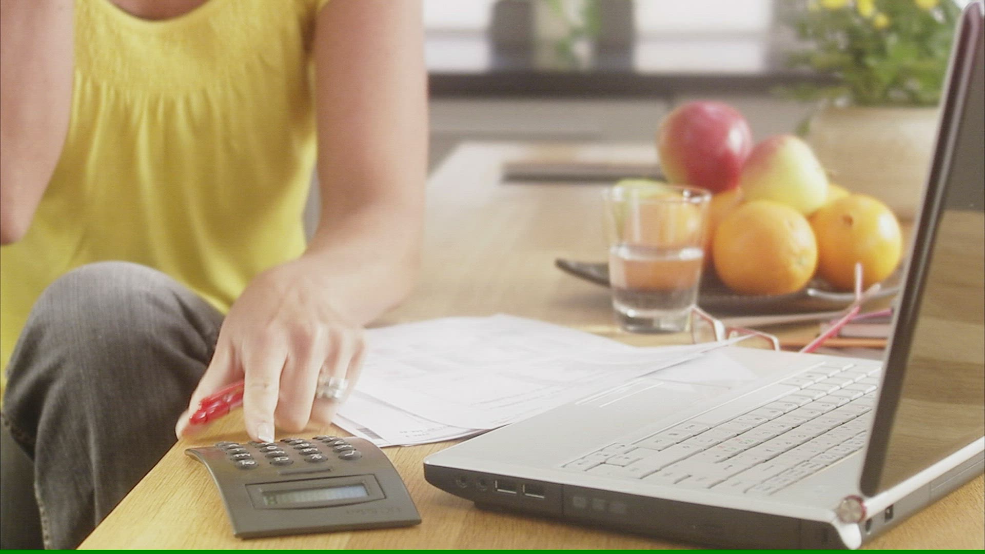 MS TU Mature woman calculating bills in kitchen / Stockholm; Sweden; Scandinavian Peninsula.