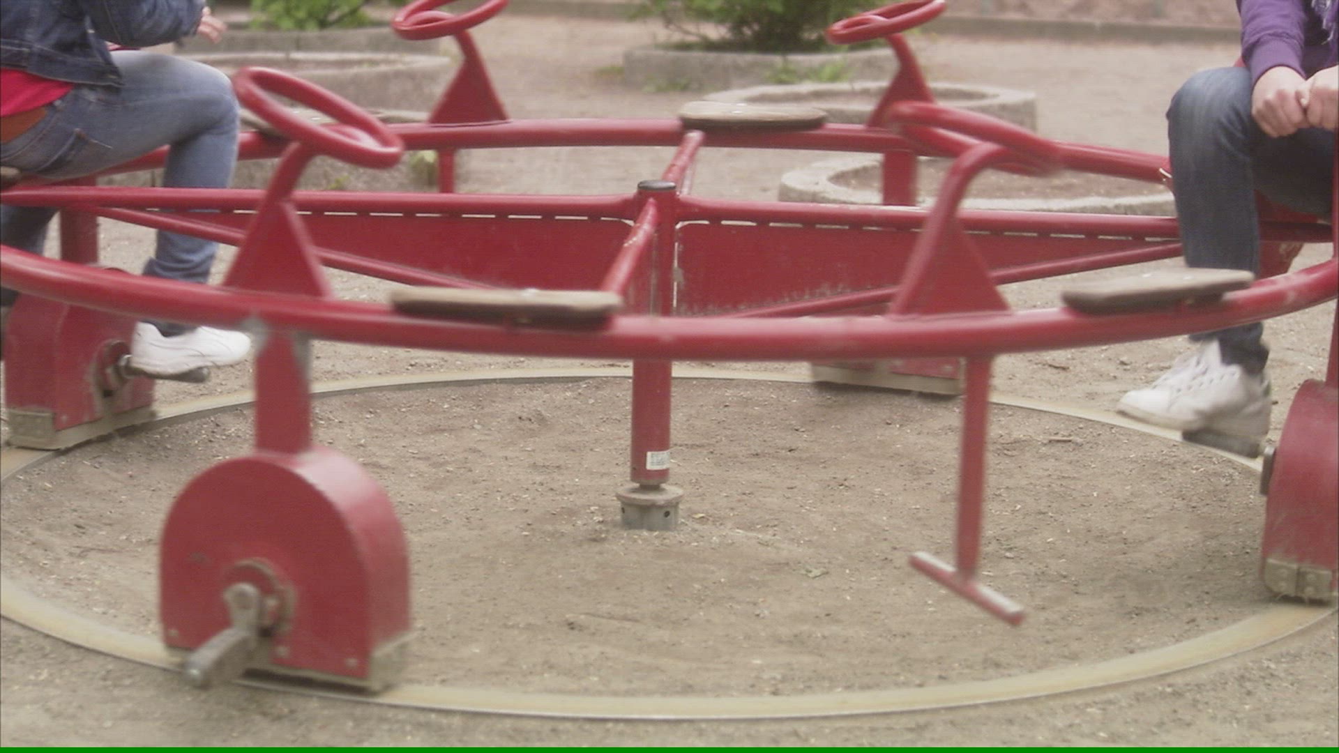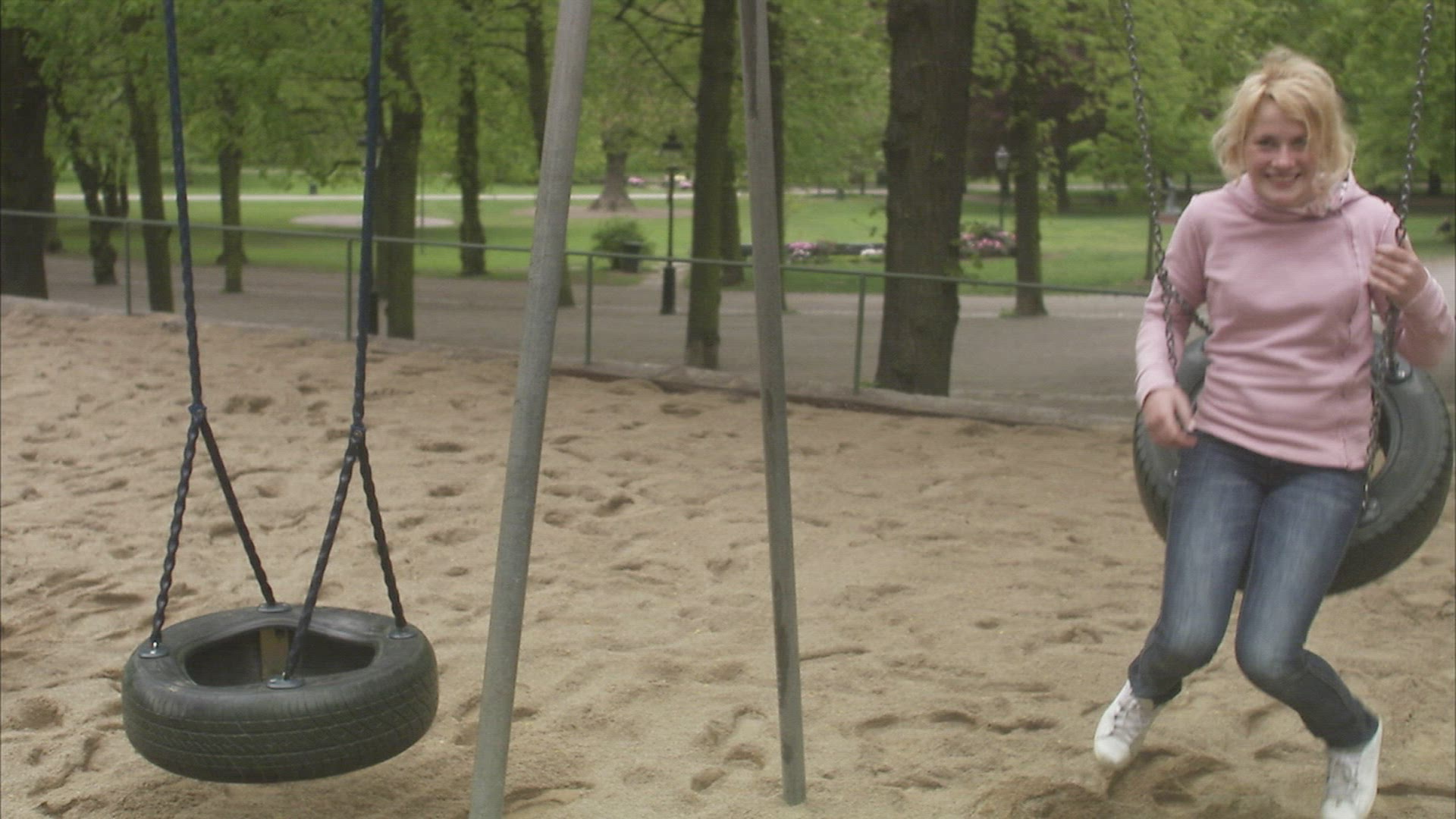MS TD Two teenage girls playing in playground / Stockholm; Sweden; Scandinavian Peninsula.