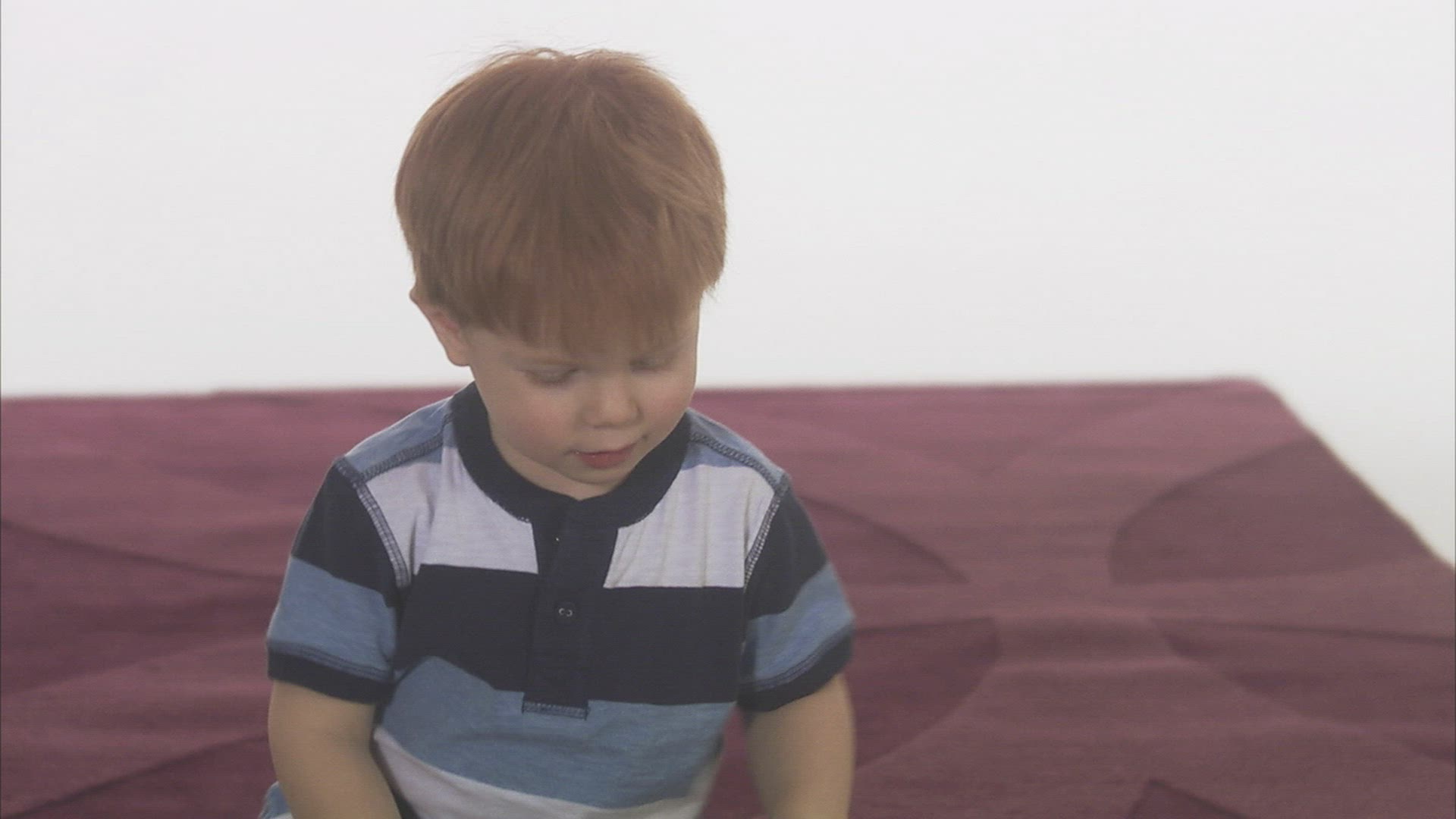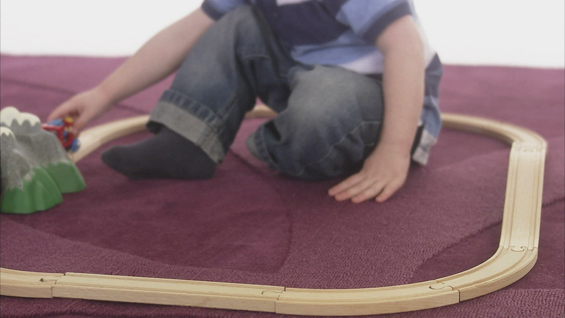 1100508 - 4 year old boy plays with building block spaceship pretending to fire missiles