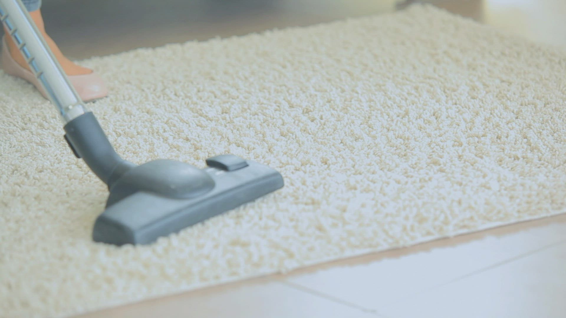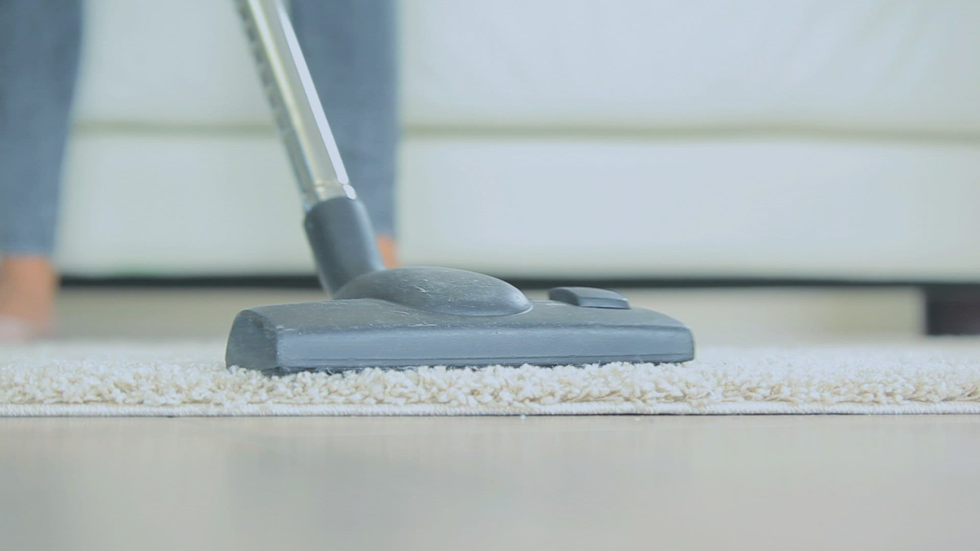 A pregnant woman lying on a couch and a man vacuuming; Sweden.
