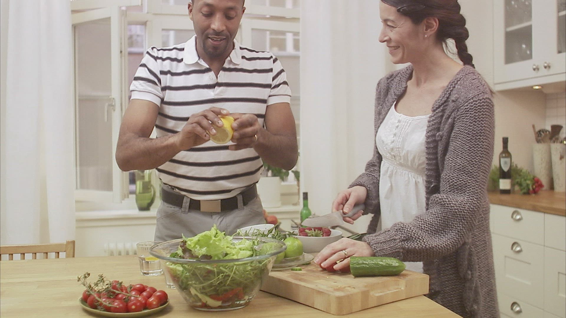 A man and a woman preparing a salad together; Sweden.