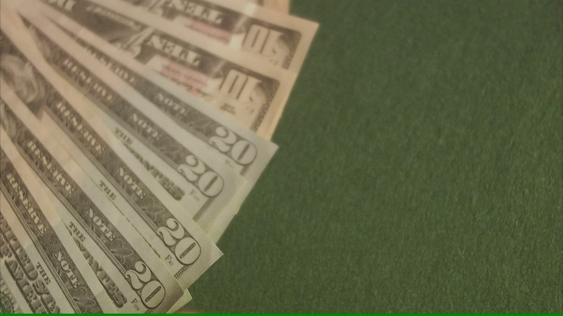 A game of dice on a pile of dollar bills.