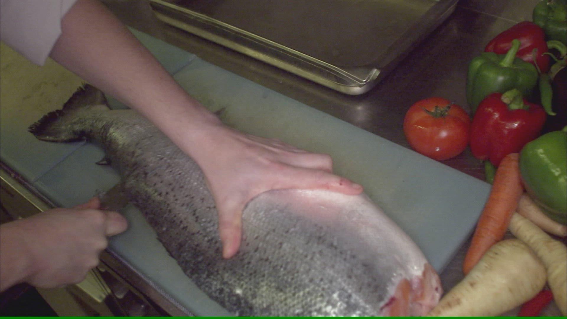 The preparing of fish in a restaurant kitchen; Sweden.
